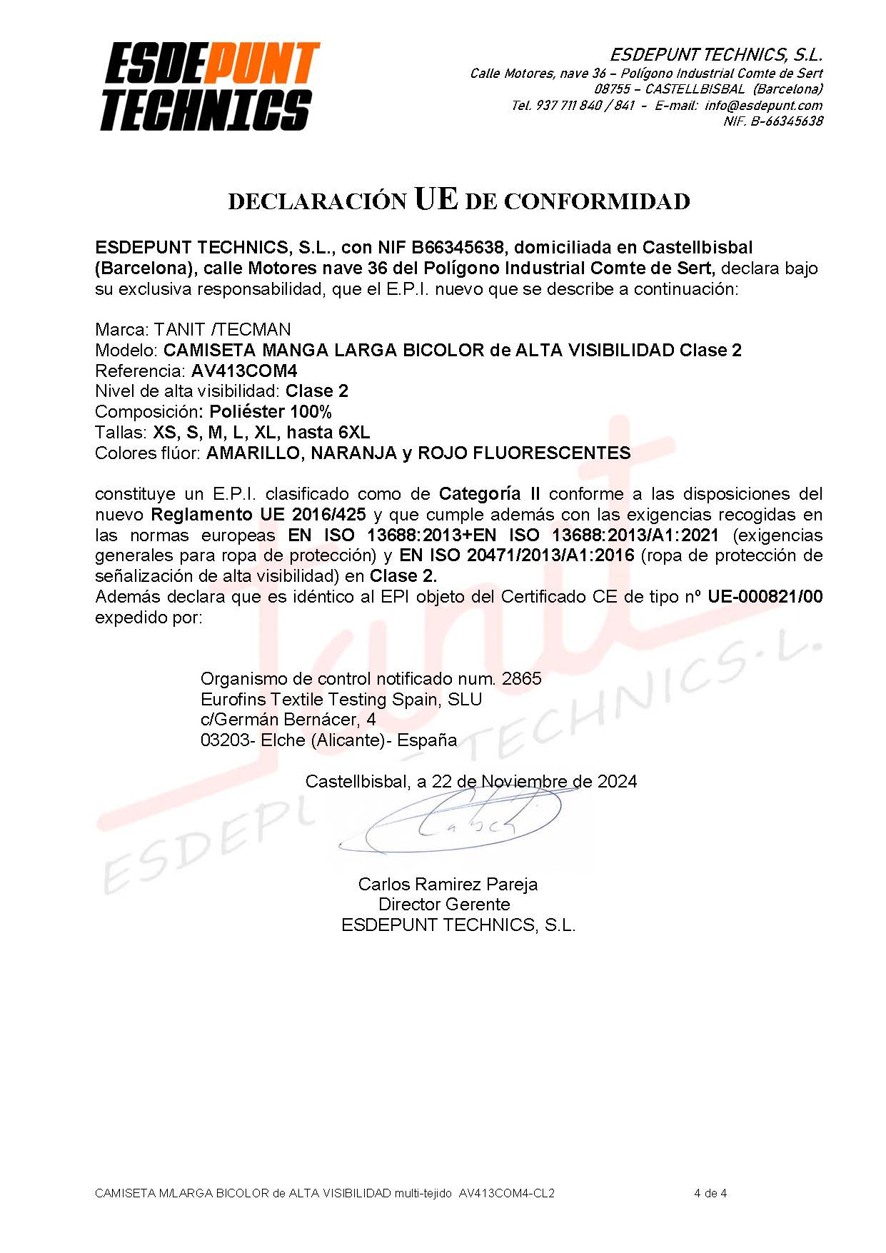 Todos los Equipos de Protección Individual (EPI) que presentamos en este catálogo han sido fabricados teniendo en cuenta las exigencias esenciales de sanidad y seguridad contenidas en las normas europeas EN ISO 13688:2013+EN ISO 13688:2013/A1:2021 y en este caso, también la normativa EN ISO 20471:2013/A1:2016 para la alta visibilidad