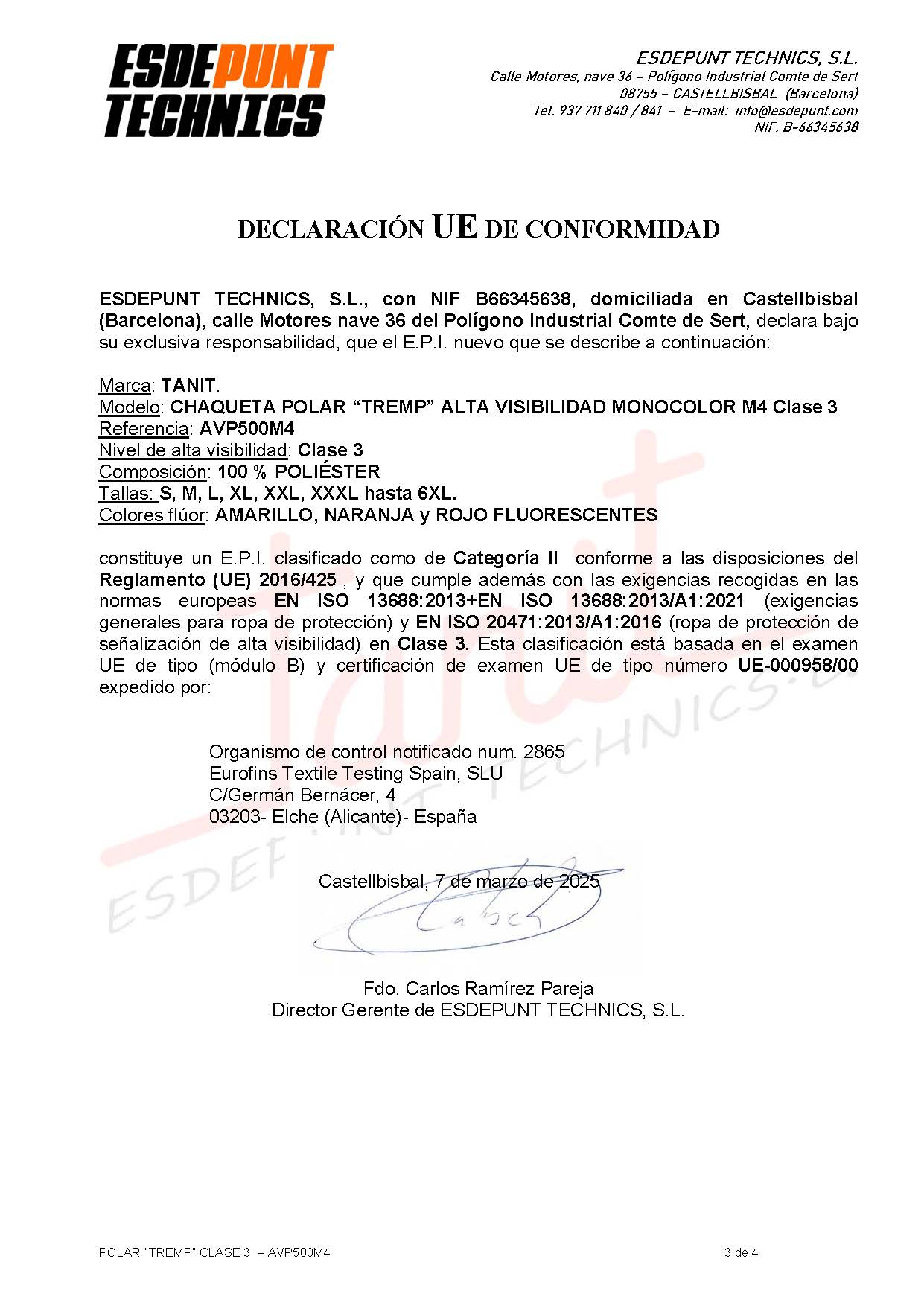Todos los Equipos de Protección Individual (EPI) que presentamos en este catálogo han sido fabricados teniendo en cuenta las exigencias esenciales de sanidad y seguridad contenidas en las normas europeas EN ISO 13688:2013+EN ISO 13688:2013/A1:2021 y en este caso, también la normativa EN ISO 20471:2013/A1:2016 para la alta visibilidad