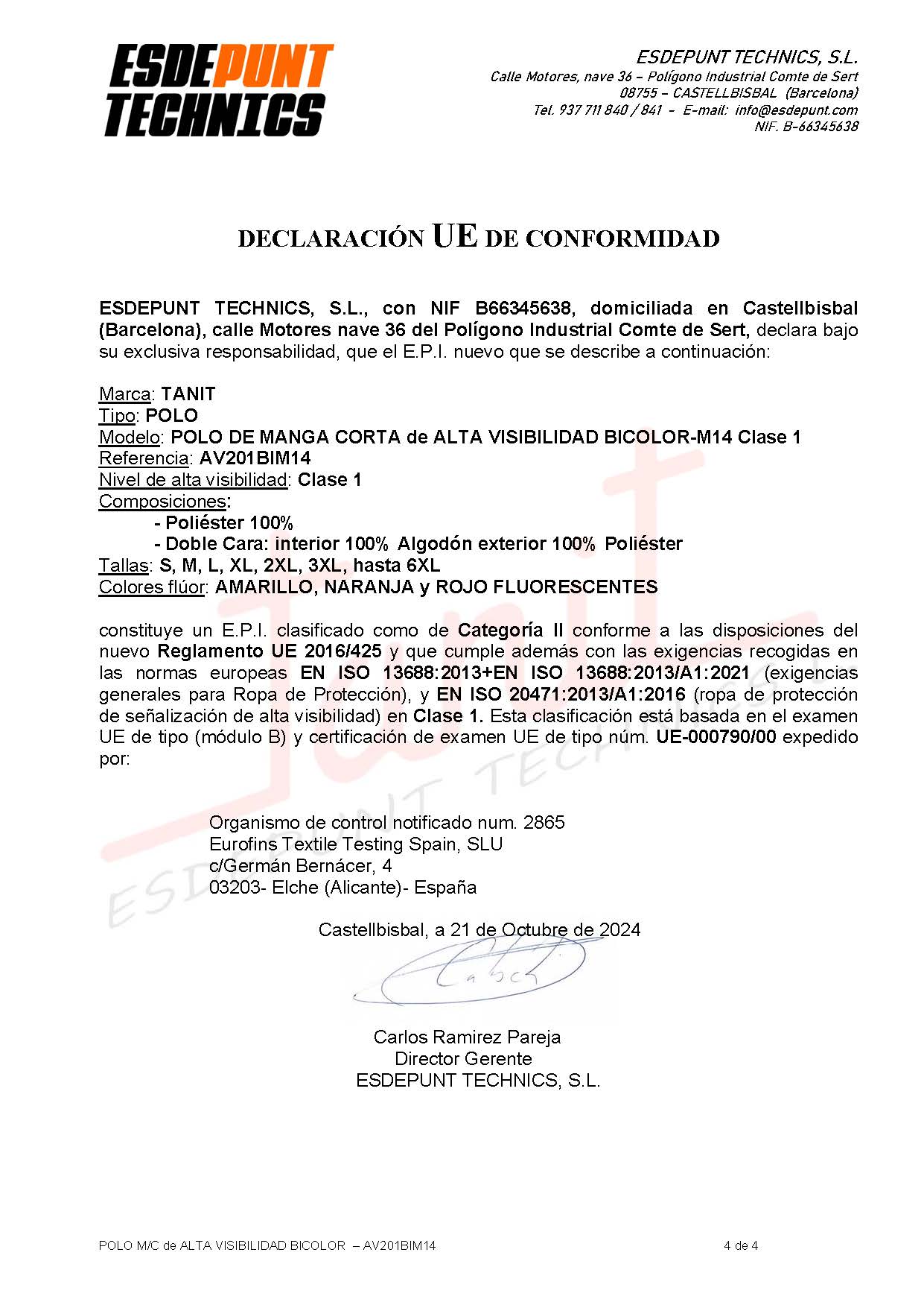 Todos los Equipos de Protección Individual (EPI) que presentamos en este catálogo han sido fabricados teniendo en cuenta las exigencias esenciales de sanidad y seguridad contenidas en las normas europeas EN ISO 13688:2013+EN ISO 13688:2013/A1:2021 y en este caso, también la normativa EN ISO 20471:2013/A1:2016 para la alta visibilidad