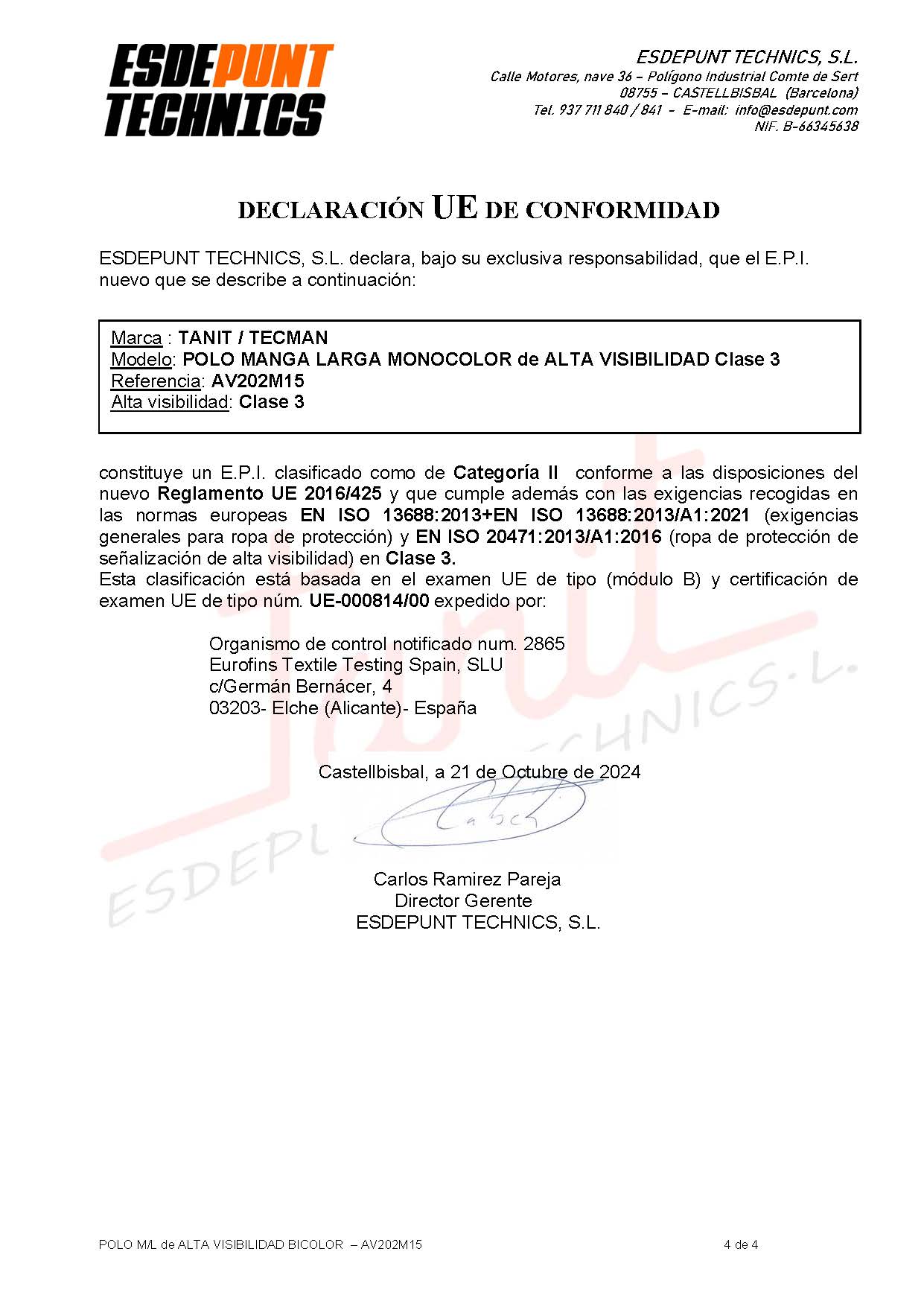 Todos los Equipos de Protección Individual (EPI) que presentamos en este catálogo han sido fabricados teniendo en cuenta las exigencias esenciales de sanidad y seguridad contenidas en las normas europeas EN ISO 13688:2013+EN ISO 13688:2013/A1:2021 y en este caso, también la normativa EN ISO 20471:2013/A1:2016 para la alta visibilidad