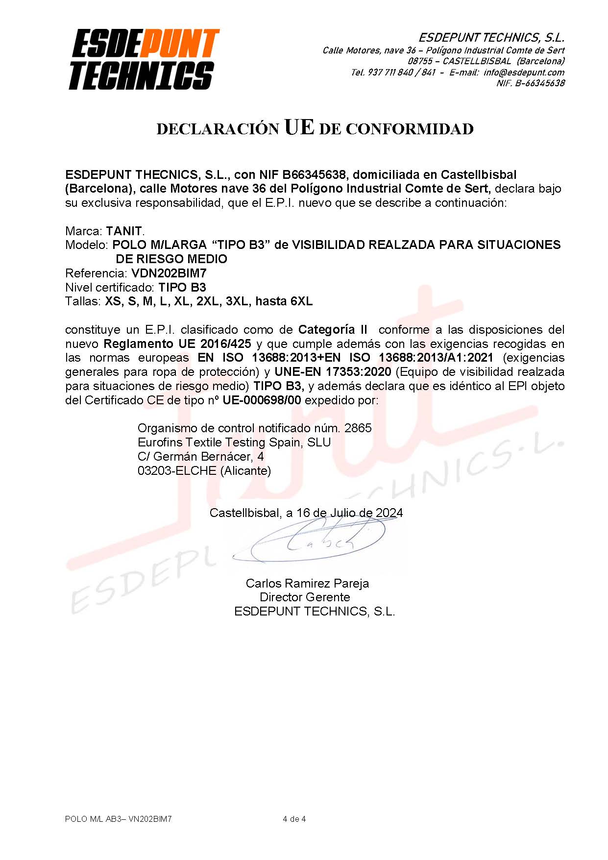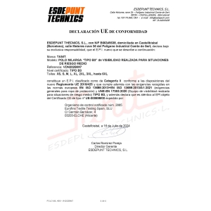 Todos los Equipos de Protección Individual (EPI) que presentamos en este catálogo han sido fabricados teniendo en cuenta las exigencias esenciales de sanidad y seguridad contenidas en las normas europeas EN ISO 13688:2013+EN ISO 13688:2013/A1:2021 y en este caso, también la normativa EN ISO 17353:2020 para la Visibilidad Realzada.